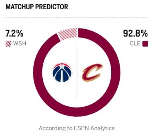 ESPN今日給出本場勝率預測,騎士92.8%占壓倒性優(yōu)勢,奇才只有7.2%。