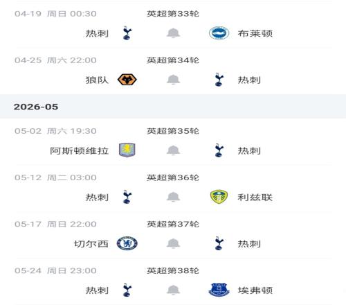 在剩余的最后6輪比賽中,熱刺三個主場三個客場,將客場對陣維拉、切爾西,最后一輪主場對陣埃弗頓。