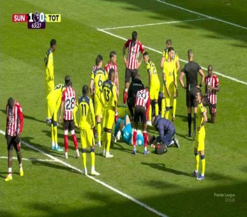 丟球后沒多久,場上的驚魂一幕就來了。布萊恩·布羅貝似乎輕輕推了羅梅羅一把,導致奮力回追活球的羅梅羅直接和自家門將金斯基撞得人仰馬翻。桑德蘭球星諾亞·薩迪基見狀,急忙瘋狂揮手召喚隊醫(yī)趕緊進場救人。