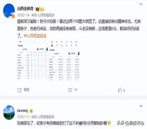 媒體人“山西全體育”發(fā)文點(diǎn)評(píng)說(shuō)道:籃板球又輸啦!防守太松啦!最近這兩個(gè)問(wèn)題太明顯了。這直接反映出精神狀態(tài)。尤其是張寧,傷愈歸來(lái)后,攻防兩端沒(méi)有表現(xiàn),斗志沒(méi)有啦,這場(chǎng)更是0分。都該好好談話(huà)了。
