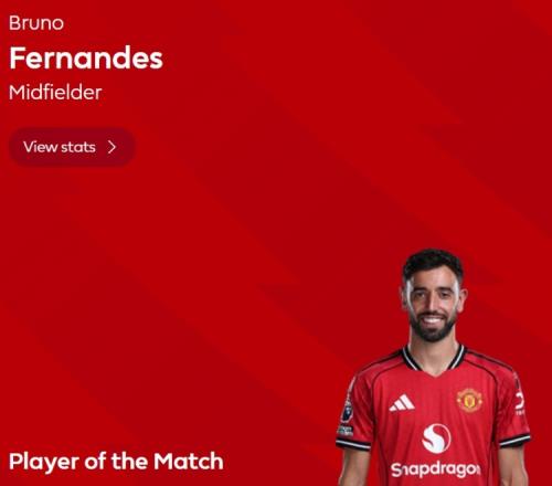 雖然本場比賽曼聯(lián)失利,但是B費表現(xiàn)依然出色,他送出一次助攻,還有5次關(guān)鍵傳球,賽后當選英超官方球迷票選全場最佳球員。