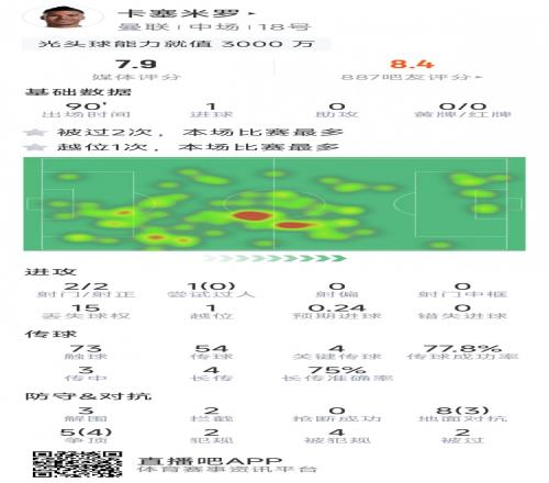卡塞米羅本場數(shù)據(jù):1粒進(jìn)球,2射2正,4次關(guān)鍵傳球,評分7.9分