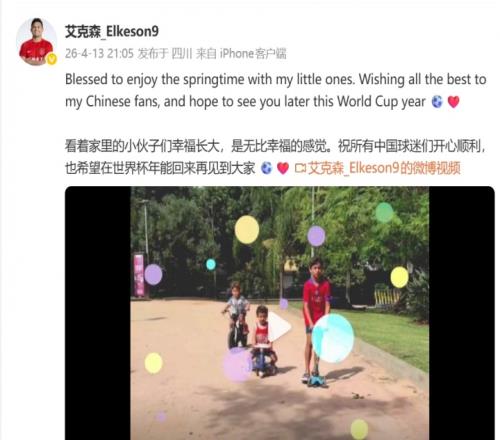 艾克森在社媒雙語發(fā)文:Blessed to enjoy the springtime with my little ones. Wishing all the best to my Chinese fans, and hope to see you later this World Cup year ????