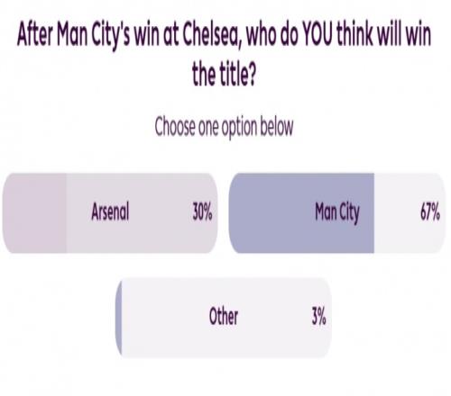 最新的投票結(jié)果顯示,現(xiàn)在僅有30%的球迷看好目前榜首的阿森納奪冠,而有67%的球迷認(rèn)為曼城最終將反超阿森納奪魁。另外還有3%的人認(rèn)為,冠軍將從其他球隊(duì)當(dāng)中產(chǎn)生。