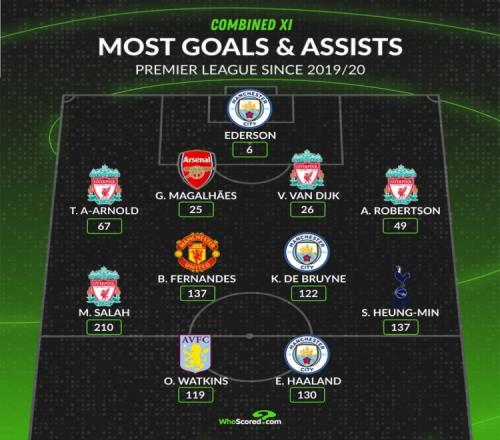 前鋒:沃特金斯(阿斯頓維拉,119球)、哈蘭德(曼城,130球)