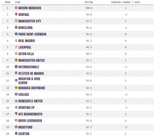 OPTA全球俱樂(lè)部實(shí)力榜:拜仁、阿森納、曼城、巴薩以及巴黎居前5