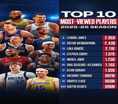 另外,NBA官方宣布,詹姆斯以28.5億的播放量登頂2025-26賽季NBA社媒與數(shù)字平臺球員熱度觀看榜榜首。馬刺球星文班亞馬以24.3億播放量位居第二,詹姆斯的隊友東契奇以21.1億位列第三,里夫斯6.96億排名第十。湖人三位球星都進入前十。