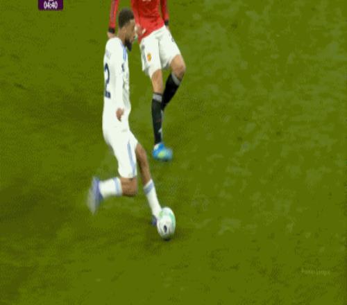 第45分鐘,曼聯(lián)后場(chǎng)出球再出問題,拉門斯和約羅連接失誤,就是這一球,又一個(gè)該發(fā)力解圍的球,約羅選擇用右腳勉強(qiáng)處理,結(jié)果解圍不遠(yuǎn),剛好落在中間,利茲聯(lián)又從卡塞米羅身后搶出來,差點(diǎn)就打出了第三球: