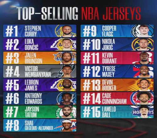 今天NBA官方曬出本賽季球衣銷量,庫里高居第一,東契奇位列第二,布倫森排名第三。塔圖姆缺席大半個賽季,依然能排名第七,獨(dú)行俠狀元弗拉格排名第九。值得一提的是,榜單上的華子和坎寧安等人都失去了最佳陣容的評獎資格。