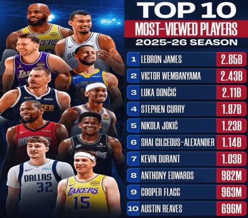 6.41歲的勒布朗社媒播放量28.5億排第一,證明41歲的勒布朗依舊是聯(lián)盟門面;
