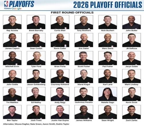 北京時間4月14日,NBA官宣今年附加賽與季后賽首輪的36位裁判大名單,由名哨福斯特領(lǐng)銜,他吹罰了262場季后賽在本次名單中最多,還有一位女裁判Natalie Sago。