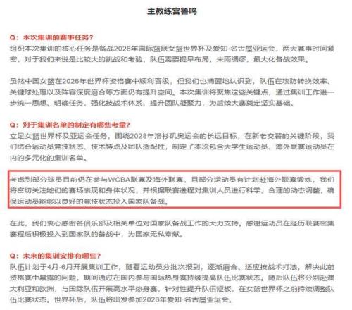 北京時(shí)間4月14日消息,中國(guó)女籃新一期集訓(xùn)名單于4月13日公布,標(biāo)志著備戰(zhàn)2026年女籃世界杯與亞運(yùn)會(huì)的長(zhǎng)期工程正式啟動(dòng)。本次集訓(xùn)周期長(zhǎng)達(dá)5個(gè)月(4月15日至9月26日),遠(yuǎn)超國(guó)際主流國(guó)家隊(duì)的備戰(zhàn)節(jié)奏,引發(fā)外界對(duì)訓(xùn)練模式的廣泛討論。面對(duì)前隊(duì)長(zhǎng)楊力維“長(zhǎng)時(shí)間集訓(xùn)犧牲球員職業(yè)發(fā)展”的質(zhì)疑,主教練宮魯鳴以行動(dòng)回應(yīng):既然3個(gè)月被認(rèn)為過(guò)長(zhǎng),那就推行“最優(yōu)解”——5個(gè)月系統(tǒng)化封閉訓(xùn)練,這一決策彰顯其“以國(guó)家隊(duì)為絕對(duì)核心”的執(zhí)教哲學(xué)。