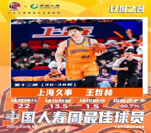 場均22分13.5板,官方:王哲林當(dāng)選常規(guī)賽第十二周最佳球員