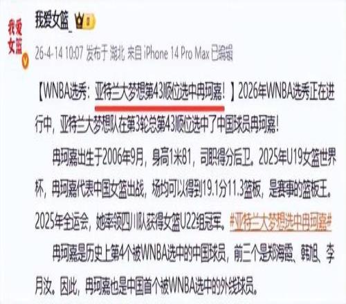 眾所周知,昨天中國(guó)女籃為備戰(zhàn)2026年國(guó)際籃聯(lián)女籃世界杯及名古屋亞運(yùn)會(huì),中國(guó)籃協(xié)官宣新一輪中國(guó)女籃集訓(xùn)名單。這份名單一共有19人,值得一提的是,無(wú)緣入選中國(guó)女籃集訓(xùn)名單的一位隊(duì)員,卻今天在WNBA選秀大會(huì)上被亞特蘭大夢(mèng)想第43順位選中。這真的有些出人意料,也引起中國(guó)球迷的熱議。