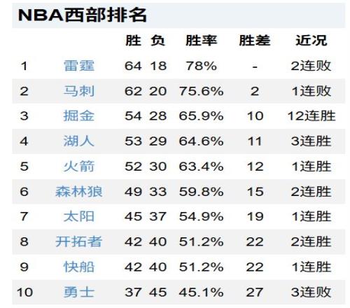 西部前10是雷霆、馬刺、掘金、湖人、火箭、森林狼、太陽、開拓者、快船和勇士。