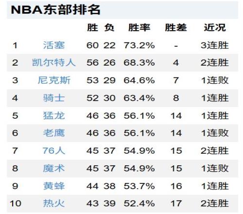 東部前10分別是活塞、凱爾特人、尼克斯、騎士、猛龍、老鷹、76人、魔術、黃蜂和熱火。
