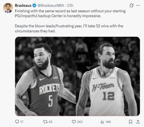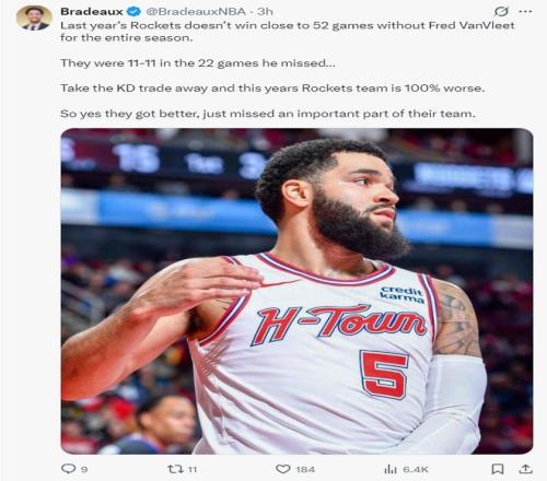 火箭記者Bradeaux寫(xiě)道:去年那支火箭沒(méi)有范弗利特不可能拿52勝,在去年他缺席的22場(chǎng)比賽中火箭11勝11負(fù)。如果火箭隊(duì)沒(méi)能換來(lái)杜蘭特,今年的火箭實(shí)力會(huì)下降100%,所以火箭是進(jìn)步了,只是缺少了重要的成員。