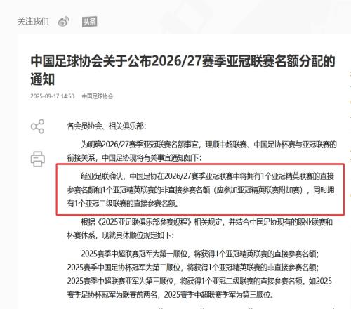 根據(jù)去年中國足協(xié)9月17日發(fā)布的《中國足球協(xié)會關于公布2026/27賽季亞冠聯(lián)賽名額分配的通知》,經(jīng)亞足聯(lián)確認,中超26/27賽季亞冠精英聯(lián)賽中擁有1個直接參賽名額和1個亞附加賽名額。