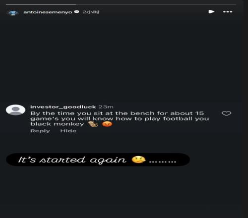 今日塞梅尼奧更新個(gè)人ins,曬出有人對(duì)自己種族歧視辱罵。該網(wǎng)友罵塞梅尼奧:當(dāng)你坐替補(bǔ)席15場(chǎng)比賽后,你就知道怎么踢球了,你這只黑猴子。