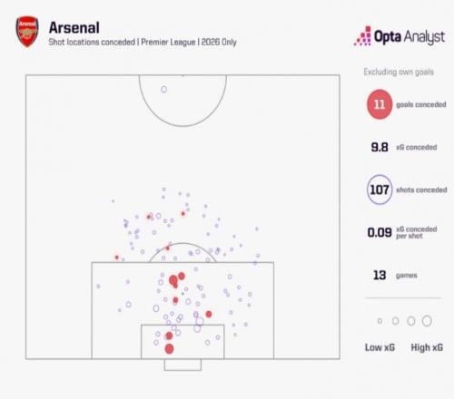 放眼整體,阿森納的核心數(shù)據(jù)依舊十分出色。他們?nèi)允怯⒏裉m足壇防守最好的球隊(duì)。單看2026年至今的數(shù)據(jù),阿森納是英超唯一場均預(yù)期失球不足1球的球隊(duì)(0.76)。