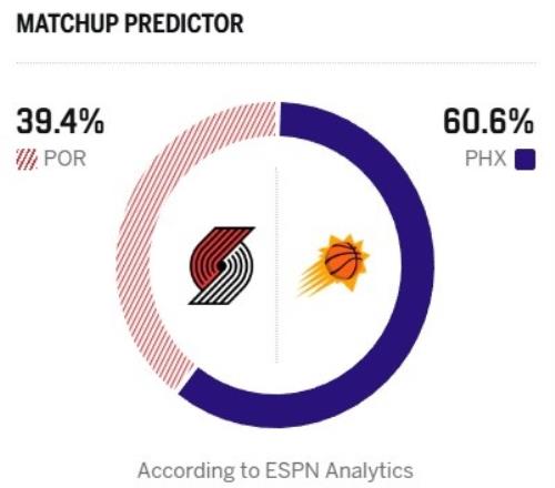 誰贏誰打馬刺!ESPN明日勝率預(yù)測(cè):太陽60.6%占優(yōu)開拓者為39.4%
