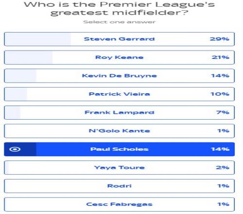 在球迷投票環(huán)節(jié),杰拉德同樣以29%的得票率排名榜首,其次則是羅伊-基恩(21%)。斯科爾斯、德布勞內(nèi)同樣得到14%的投票。從這一投票結(jié)果來看,球迷在斯科爾斯的歷史地位上無法認(rèn)同卡拉格的觀點(diǎn)。