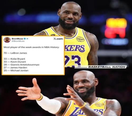 先說下,周最佳對于詹姆斯而言并不罕見,算上這一次,他職業(yè)生涯一共拿了70次周最佳,這個數(shù)字在NBA歷史斷檔領(lǐng)先,排在他之后的分別是:科比33次&杜蘭特33次、哈登27次、喬丹25次,詹姆斯比身后兩位加起來還多。