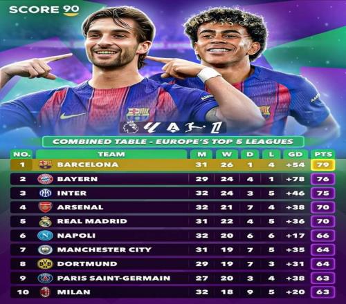 歐洲五大聯(lián)賽已經(jīng)進(jìn)入最后沖刺階段,Score90統(tǒng)計(jì)了五大聯(lián)賽合并的積分榜,表格從左至右分別為比賽場(chǎng)數(shù)、勝、平、負(fù)、凈勝球以及積分。巴薩以79分位居第一,拜仁第二,國(guó)米第三,阿森納第四。