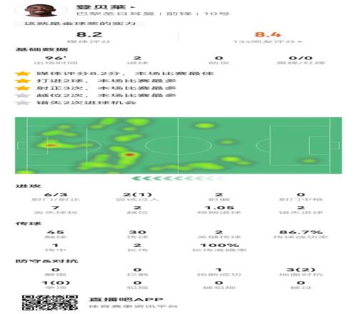 登貝萊本場(chǎng)6射3正進(jìn)2球2越位+2錯(cuò)失進(jìn)球+2關(guān)鍵傳球獲評(píng)8.2分