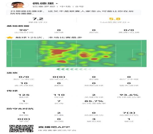 體育播報(bào)4月15日宣 巴薩在本輪歐冠2-1客勝馬競(jìng),總比分2-3被淘汰,佩德里本場(chǎng)數(shù)據(jù)如下: