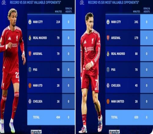 德轉(zhuǎn)數(shù)據(jù)統(tǒng)計(jì)顯示,本賽季代表利物浦出戰(zhàn)身價(jià)最高的6個(gè)對(duì)手(曼城、皇馬、巴黎、阿森納、曼聯(lián)、切爾西),維爾茨(共計(jì)659分鐘)和埃基蒂克(共計(jì)494分鐘)僅收獲0球0助攻: