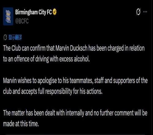 伯明翰官方:前鋒杜克施因涉嫌酒駕被起訴,將對(duì)行為承擔(dān)全部責(zé)任