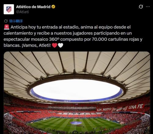 馬競(jìng)官方寫道:“今天請(qǐng)?zhí)崆斑M(jìn)入球場(chǎng)!從熱身階段就開(kāi)始為球隊(duì)吶喊助威,并參與由70000張紅白卡片組成的壯觀360度環(huán)繞馬賽克拼圖,以此迎接我們的球員入場(chǎng)?!?/p>