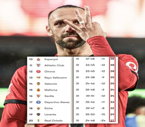 在西甲積分榜上,位居第10的西班牙人拿到38分,而位居第18 的埃爾切則拿到32分,也就是說第10和第18僅有6分的差距。因此,從第10到第18都有降級的可能性。