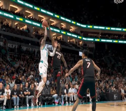 第四節(jié)決戰(zhàn),維金斯空接隔扣打成2+1,D-米切爾撤步再中三分,熱火轟出12-0打停黃蜂。布里奇斯打板2+1投進,黃蜂追近比分。最后三分鐘,維金斯連中兩記三分,拉開到6分分差。米勒頂著防守三分命中,黃蜂剩18秒落后熱火1分。希羅兩罰全中,懷特再中三分追平比分。希羅頂投三分不中,雙方進入加時。