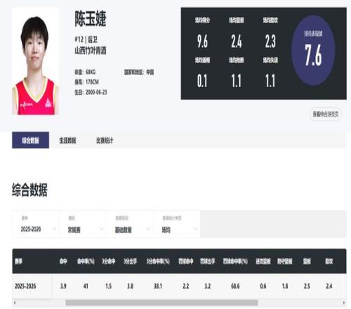 本賽季的常規(guī)賽陳玉婕場均26.9分鐘,拿到9.6分2.3助攻2.4籃板1.1搶斷,命中率41%,三分命中率38.1%,在常規(guī)賽她還是一個合格的外線投手、防守者,可進(jìn)入季后賽數(shù)據(jù)就下滑不少。