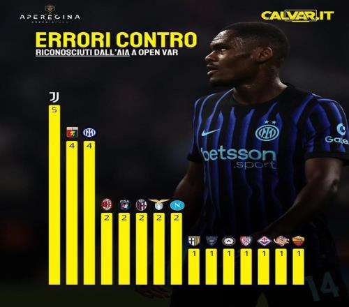 北京時(shí)間4月15日,意大利媒體Calvar.it統(tǒng)計(jì)出了本賽季至今意甲球隊(duì)遭遇VAR誤判的次數(shù),尤文圖斯5次位居第一,遭遇4次VAR誤判的國(guó)際米蘭目前仍以9分優(yōu)勢(shì)領(lǐng)跑積分榜。