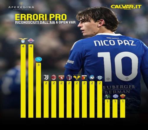 本賽季意甲球隊(duì)遭遇VAR誤判次數(shù):