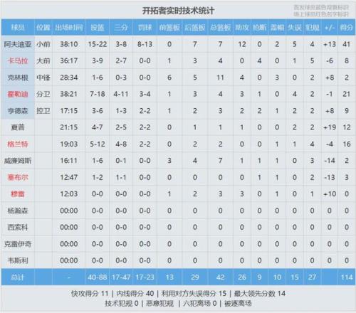 開拓者迅速推到前場,格蘭特又扣了一個。全場結(jié)束,開拓者114-110險勝太陽。阿夫迪亞41分7板12助2帽、霍勒迪21分4板3助、格蘭特16分、卡馬拉8分4板4斷;杰倫-格林35分5板2助、布克22分4助、狄龍20分7板2助4斷。