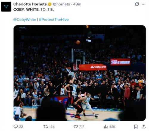 科比-懷特是黃蜂交易截止日才換來的新援,他這是黃蜂生涯的第第26場比賽,附加賽下半?yún)^(qū)的球隊(duì)是單敗淘汰賽,懷特這個三分球的含金量非常之高。