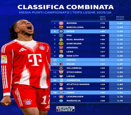 德轉盤點五大聯(lián)賽場均積分:拜仁2.62分+78凈勝球,兩項均第一