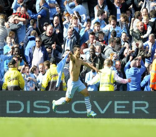 這是英超歷史上最具標(biāo)志性的畫面之一:阿圭羅在第94分鐘打入制勝球,將冠軍獎(jiǎng)杯從死敵曼聯(lián)手中奪走后,他脫掉球衣慶祝。