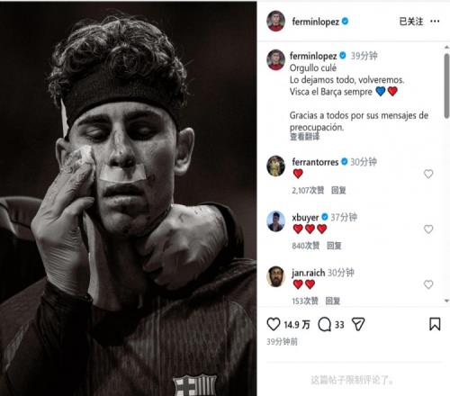 此役巴薩中場(chǎng)費(fèi)爾明被馬競(jìng)門將穆索踢到臉部,費(fèi)爾明社媒曬出臉部受傷的照片,并寫道:“巴薩人的榮耀!我們已傾盡全力,我們會(huì)再回來的。巴薩萬歲,永遠(yuǎn)!感謝大家的關(guān)心留言。”