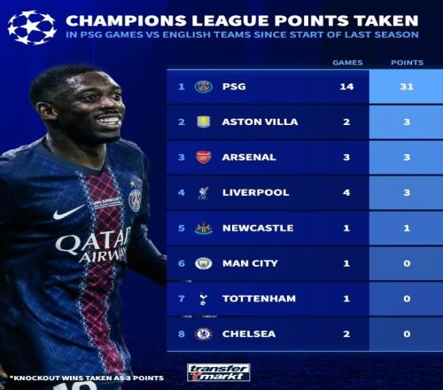 巴黎在近兩個(gè)賽季歐冠14次對(duì)陣英超球隊(duì)拿到31分(淘汰賽取勝也算作3分),而對(duì)陣巴黎戰(zhàn)績(jī)最好的維拉也僅是2戰(zhàn)1勝1負(fù),阿森納3戰(zhàn)1勝2負(fù),利物浦4戰(zhàn)1勝3負(fù),紐卡1平,曼城、熱刺均是1戰(zhàn)1敗,切爾西則是2戰(zhàn)2敗。