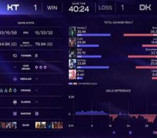 本場比賽KT一共完成了33次擊殺,是KT的一倍還多才艱難拿下勝利,雙方一共爆發(fā)了48個(gè)人頭,而本賽季LCK的場均擊殺為29次。