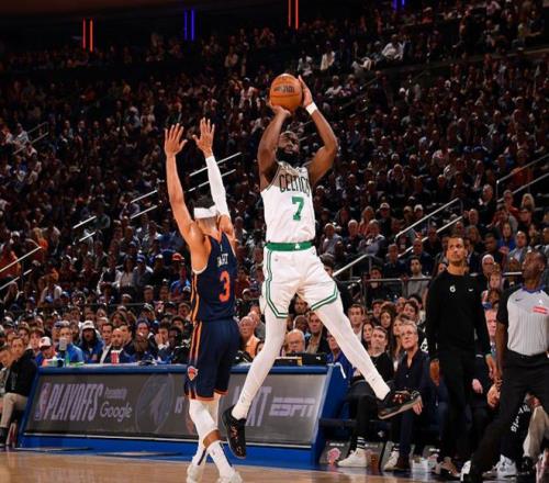 原本高階數(shù)據(jù)五大天王,全部都是西部:約基奇+亞歷山大+文班亞馬+東契奇+小卡,康寧漢姆出場次數(shù)不足,馬克西和布倫森又遠在第二檔之外,單從高階數(shù)據(jù)來看,第一陣如果給東部,也應(yīng)該先給活塞的杜倫,本賽季綜合高階數(shù)據(jù)聯(lián)盟第八。但杜倫畢竟從名氣到數(shù)據(jù),確實也都不如布朗。布朗高階數(shù)據(jù)并不好的原因,在于布朗自身失誤多,在場防守不算好,能確保產(chǎn)量,但沒有足夠的贏球保證下限的能力。我再列出一組數(shù)據(jù),凱爾特人想沖冠,一定要過尼克斯這一關(guān),畢竟尼克斯是凱爾特人絕對克星。