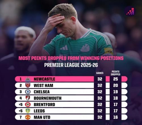 體育播報4月15日宣 數(shù)據(jù)機構(gòu)OPTA統(tǒng)計了本賽季英超在領(lǐng)先情況下最終丟分情況,紐卡斯爾25分最多。