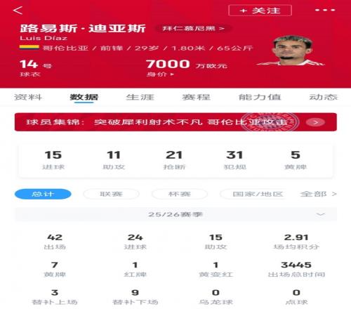 去年夏窗,拜仁花費(fèi)7500萬歐轉(zhuǎn)會(huì)費(fèi)從利物浦引進(jìn)迪亞斯。加盟拜仁后迪亞斯迅速融入球隊(duì),與凱恩、奧利塞組成了火力猛烈的進(jìn)攻三叉戟。本賽季到目前為止,迪亞斯在拜仁出戰(zhàn)42場(chǎng),貢獻(xiàn)24球15次助攻。