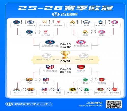 體育播報04月16日宣 歐冠1/4決賽次回合全部戰(zhàn)罷,半決賽巴黎將戰(zhàn)拜仁、馬競將戰(zhàn)阿森納。