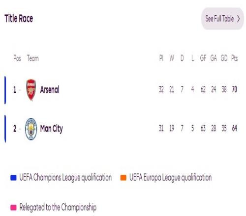 然而,上周六如果他們能夠擊敗伯恩茅斯,本可以將領(lǐng)先優(yōu)勢(shì)擴(kuò)大到12分,但如果曼城在本周日的直接對(duì)決中獲勝,雙方的差距將縮小到僅3分,而且瓜迪奧拉的球隊(duì)還少賽一場(chǎng),這將使他們有機(jī)會(huì)追平甚至反超阿森納。